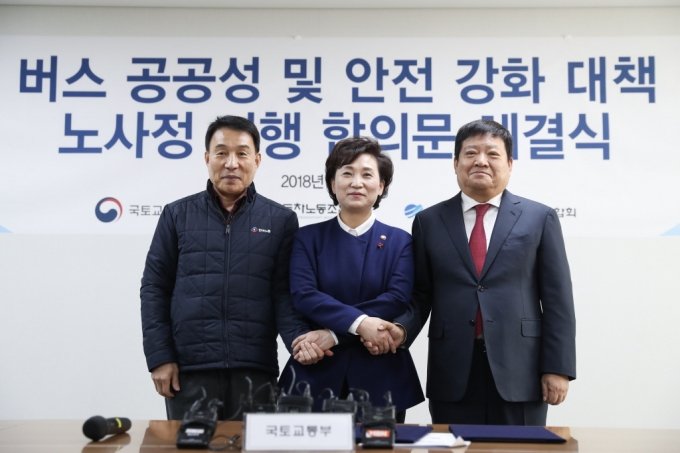 김현미 국토교통부 장관은 12월 27일(목) 11시 국토발전전시관에서 류근중 전국자동차노동조합연맹 위원장과 김기성 전국버스운송사업조합연합회장과 ‘버스 공공성 및 안전강화대책’의 이행 합의문 체결식을 가졌다.