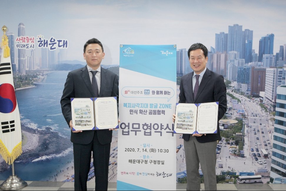 대선주조(대표 조우현)는 14일 오전 10시 30분 부산 해운대구청에서 ‘복지사각지대 발굴 존(ZONE) 인식 확산 사업’을 위한 업무협약(MOU)을 체결했다고 밝혔다.