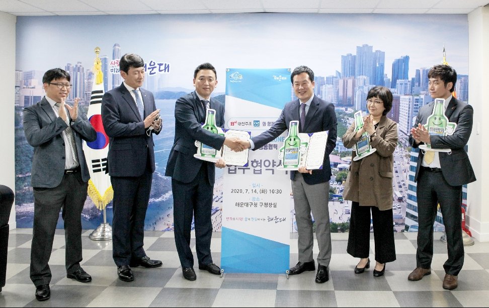 이날 협약식에는 대선주조 조우현 대표이사와 사측 관계자들, 해운대구청 홍순헌 구청장을 비롯한 구청 관계자들이 함께했다.