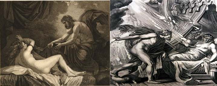 10) 연인 세멜레(Semele)와의 관계이다. 테베에 살았던 카드모스와 하르모니아의 딸 세멜레는 공주로 제우스가 그녀를 무척 사랑했다. 카드모스의 딸 세멜레에게서는 포도주의 신 디오니소스를 얻었다. 하지만 헤라의 속임수에 제우스의 본모습을 본 세멜레는 광채에 몸이 타 죽는다. 인간이었던 세멜레와의 사이에서는 술의 신 디오니소스를 낳았다. 재미있는 것은 디오니소스가 제우스의 허벅지에서 태어난다는 것이다.