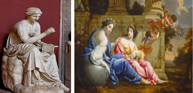 서사시의 무사 칼리오페는 그리스 신화에서 아홉 뮤즈 중에 가장 높은 뮤즈이다. 붉은 날개를 활짝 편 채 시인의 어깨에 한 팔을 걸친 아름다운 뮤즈는 아홉 명의 뮤즈 중 가장 아름다운 목소리를 지닌 서사시의 수호신이다. 주신(主神) 제우스의 명령으로 아도니스를 놓고 벌어진 여신 아프로디테와 페르세포네의 싸움에 대한 판결을 내렸다. 제우스의 명령에 의해서 이 두 여신은 칼리오페의 중재를 따라야만 했다. 두 여신은 각기 1년의 반씩 아도니스와 함께 지내도록 결정되었다. 그녀와 트라키아의 왕 오이아그로스(Oeagros) 사이에서 리라를 연주했던 영웅 오르페우스(Orpheus)가 태어났다고 한다. 또한 아폴론의 사랑을 받아 그 사이에서 히멘과 이알레모스라는 두 아들을 낳기도 했다.