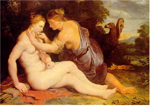 16) 정부 칼리스토(Kalisto)와의 관계이다. 제우스는 자신의 딸 아르테미스의 모습으로 변신해서는 요정 칼리스토를 유혹했다. 칼리스토는 순결의 상징인 처녀신 아르테미스를 추종하던 님프였다. 아르테미스의 모습으로 변신하여 요정 칼리스토를 속인 후 아르카디아 지방의 건국 영웅 아르카스(Arkas)를 낳았다.