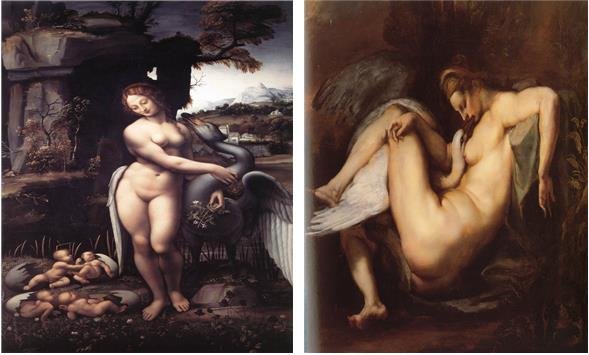 레다가 긴 모가지를 가진 백조와 사랑을 나눈 장면은 무척 로맨틱하게 보이지만 엄격하게 말하면 수간(獸姦)이다. 수간이라면 크레타의 파시파에(Phasipae)를 빼놓을 수 없다. 미노스 왕의 아내 파시파에는 포세이돈이 선물한 아름다운 황소를 보는 순간 욕정에 불타오른다. 그리고 욕정은 비극을 잉태한다. 때마침 아테네에서 조카를 죽이고 도주한 다이달로스(Daedalos)가 크레타의 궁정에 와 있던 것도 몹쓸 우연의 장난이었다. 폼페이 베티이의 집에서 나온 벽화에는 다이달로스가 암소모형을 완성해서 여왕 파시파에에게 대령하는 장면이 재현되어 있다.