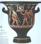 도자기 그림에는 제우스는 그의 연인을 만나기 위해 사다리를 메고 간다. 오른편에 있는 헤르메스는 램프를 들고 있다. 제우스의 연인 알크메네가 창가에 보인다.