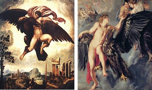 26) 동성애 정부 가뉘메데스(Ganymedes)혹은 가니메데(Ganymede)와의 관계이다. 제우스는 여자들만 사랑의 대상으로 삼은 것은 아니었다. 가뉘메데스는 트로이 왕 다르다노스(Dardanos)의 아들이었다. 이 미소년의 아름다움에 반한 제우스는 독수리로 변신하여 그를 납치하였다. 가뉘메데스는 올림포스에서 불사의 몸이 되어 신들에게 술 따르는 시중을 든다.