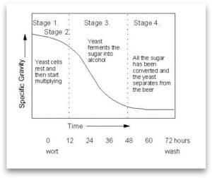 증류소 발효는 네 단계로 이루어지며, 맥즙과 최종 세척액의 비중을 그래프로 나타내면 각 단계를 확인할 수 있습니다. 시간 축척은 이해를 돕기 위한 예시일 뿐입니다.